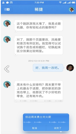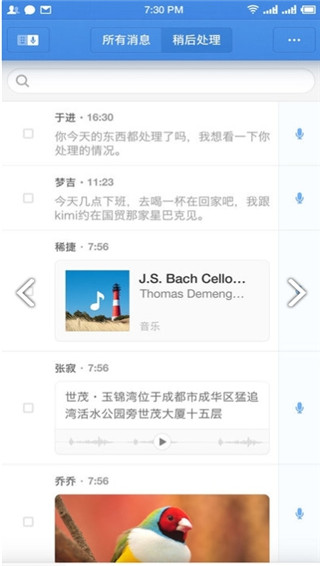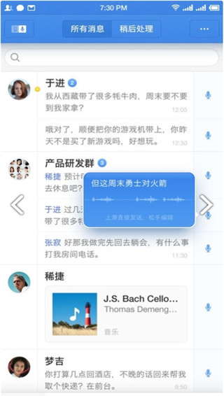 - 快捷回复功能:用户无需进入聊天页面,在App的消息列表页面就可以快捷回复消息;列表页面支持直接展开多条未读,可以语音或文字快速回复。用户可以自己选择发送信息的类型,发送语音的同时会自动转为文字并附带,语音识别率高达97%,让用户在不同场景下都有高效的选择