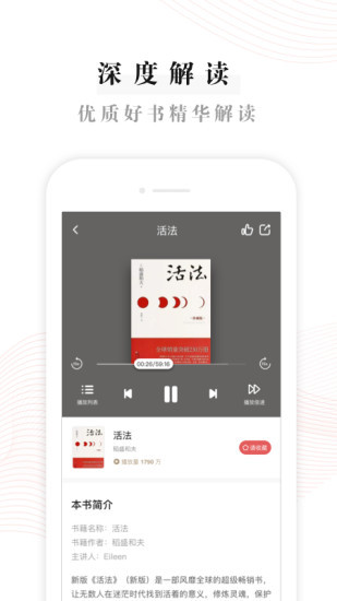 2、多个精彩分类:app涵盖了人文、生活、职场、家庭、心灵等多种类型的书籍,满足不同性别不同年龄段用户的听书需求。