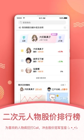 1、基于ACG人物的二次元人气交友社区为你喜欢的人物疯狂打Call,冲击股价冠军宝座。