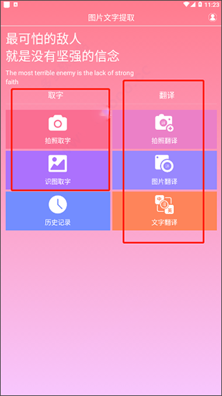 1、进入图片文字提取软件app即可发现,在主界面直接就划分了取字和翻译两大功能;