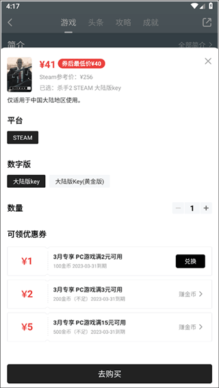 5、接着,在弹出的购买框内选好购买平台、数字版类型、兑换好优惠券后找到并点击“去购买”按钮选项;