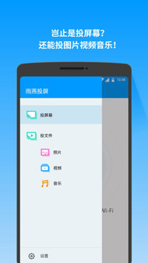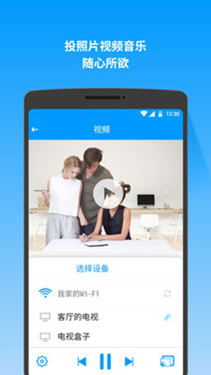 5、您可以把手机上的视频、照片、音乐投射到电视上,畅享大屏体验,支持DLNA协议,可以暂停和自动播放。(目前支持大多数电视盒子/智能电视/电视果/同屏器)