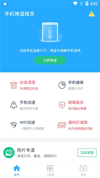 4、手机降温:手机降温精灵app安卓版可以有效降低手机CPU温度,保持正常温度;