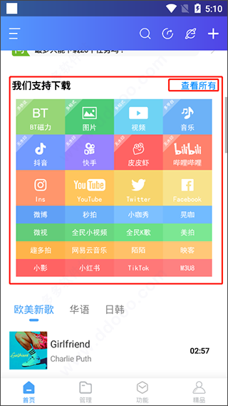 3、如果不清楚该软件支持下载哪些内容,那么可以下拉屏幕,点击查看所有;
