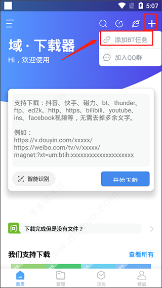 2、如果要进行BT任务,那么可以点击右上角的“+”按钮,然后“添加BT任务”;