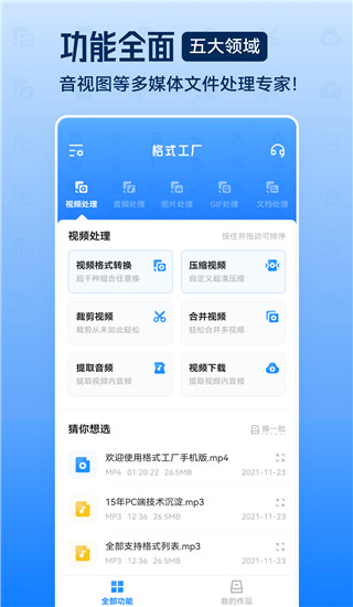 1、图片格式转换:转换图片格式,支持输出格式jpg、gif、bmp、jpeg、png、wmf、webp等。2、视频转换器:转换视频格式,支持输出格式MP4, MOV, 3GP, 3G2, MPEG, WMV, FLV, AVI等。
