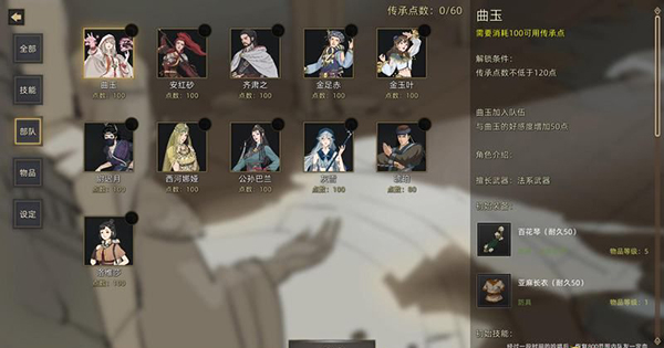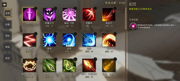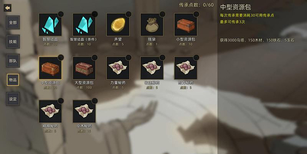 技能、道具、部队都能够通过传承点数获得。