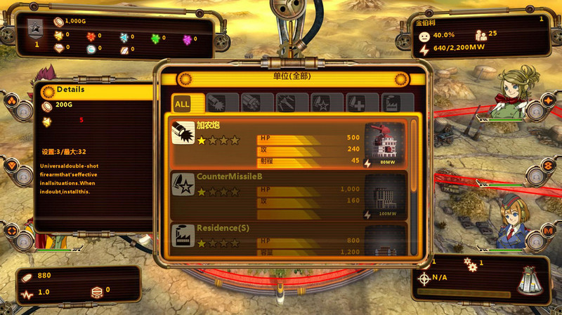 3.绝对迎击兵器:剧情第一次打败BOSS后可开发,独一无二的超级武器,需要依靠杀敌收集能量来充能,只有充满后才可发射,充满后的能量够放2发,按方块键进入发射界面手动瞄准,可以只放一发后按叉键退出。伤害极高,BOSS战时请不要乱用