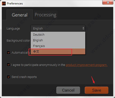 9、弹出弹窗,在Language中选择中文,点击Save,重启软件;