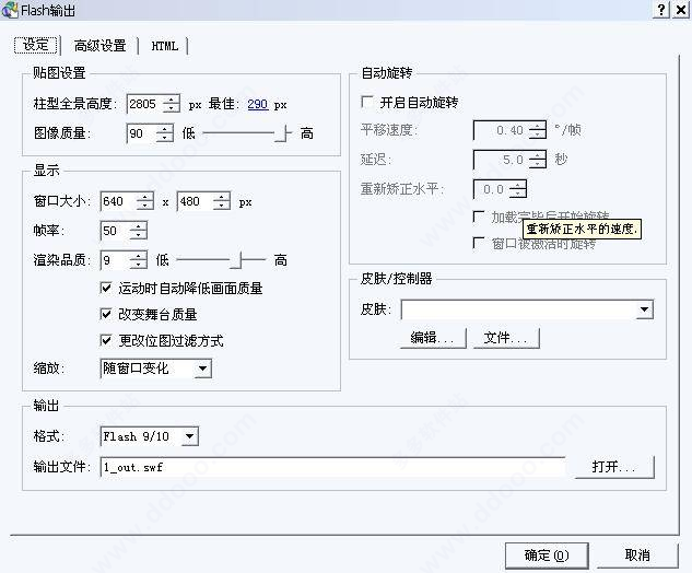 7、先看设定选项下的参数,可以根据实际需要修改图像质量,显示大小和播放帧数,如无特别需要,直接默认设置,如需全景制动旋转,可以点击右边的开启自动旋转功能,我一般选择加载完毕后开始旋转。对于播放器的控制按钮,我们可以自己编辑修改或外调他人做好的文件,对于有一定动手能力的朋友,建议自己制作个性化的皮肤。