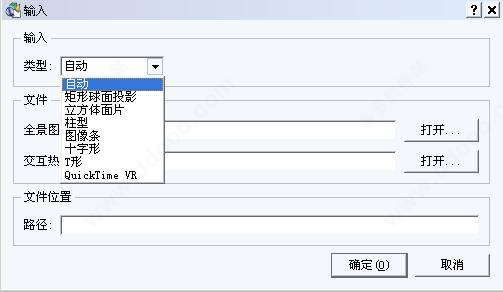 3、输入类型里有矩形球面投影、立方体面片、柱型、图像条、十字型、T型、QuickTime VR等7种类型,这里我们直接选择自动,由软件自动判断。点击全景图后的打开按钮,导入要输出的全景图