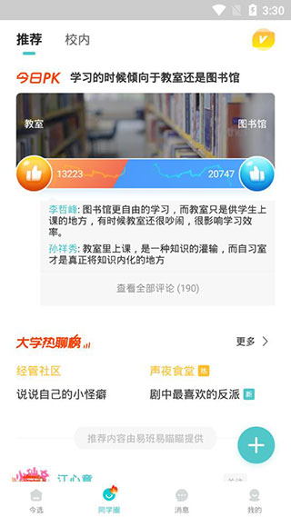 对于各位大学生来说,想要了解一些关于校园的热门资讯,那么可能需要登录校园的官方站点,通过点击资讯专栏的方式来了解那些你想要了解的内容,但是小编为你准备了一个更好的选择,它就是今日校园app最新版,这个平台为大众网友提供了一个了解校园资讯的快捷平台,而且加入了定位的功能,在经过定位之后,你就可以确定你当前所在的院校,从而平台为用户整理关于校园发生的精彩故事,让你可以点击阅读,而且一些学生用户群体也会通过这个平台发表自己的一些有趣校园故事,而且如果你对学习产生了困惑,这个今日校园还为用户提供了一个不错的功能,就是学霸交流频道,你在这里可以跟那些有着优秀成绩的学霸一同交流,学习他们的学习心得,让你可以掌握学习的要点,赶快加入吧。