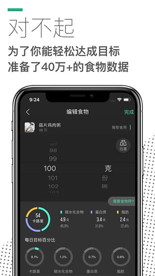 3、专业的智能硬件,体重体脂秤、食物秤与减肥App结合,测量和记录体重体脂率等身体数据、计算统计食物热量。