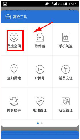 1、进入【高级工具】栏,选择【私密空间】;