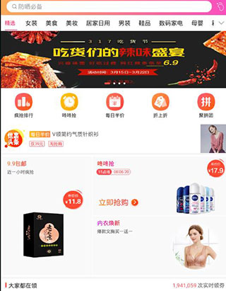 2、品牌热卖,每天上百款品牌商品专区;知名品牌,美食,美妆,家居,配饰,数码,服装,母婴,内衣,鞋包等;