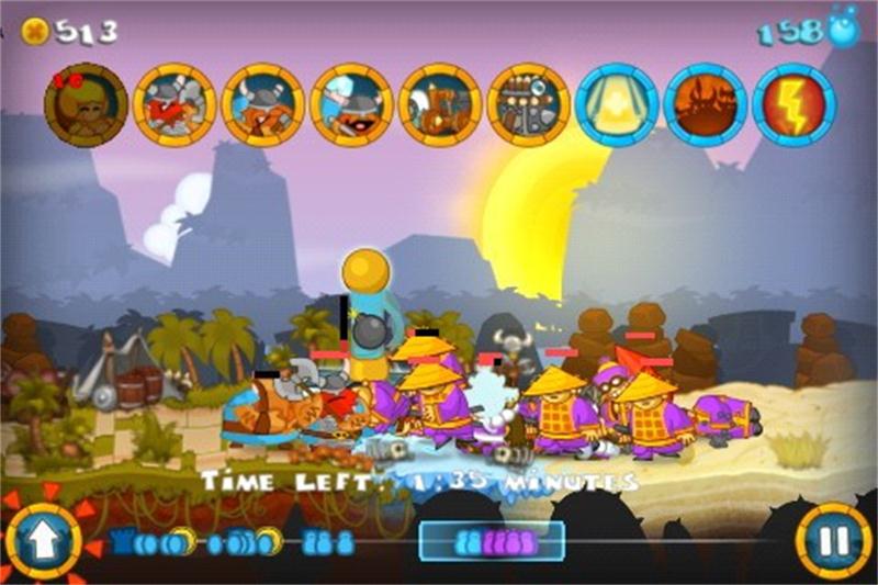 3.胜利要求:通过阻拦到达对方城下,至少一只猴子存活(我为什么知道?因为我第一次玩只死剩一只到达囧)。贴吧里很多朋友询问这一关,那我说详细点,个人感觉是对猴子单位不是很熟悉所以才会觉得难玩,猴子单位遇到敌人进行攻击后就进行一次跳跃,跳跃距离固定,所以要把握好不要跳到后面单位的面前就没事。猴子碰见步兵有可能被砍一刀再跳跃,碰见火箭兵就是被砍一刀就跳跃,碰见法师老头就被法术举起而无法跳跃。在此说明一下,法术举起是可以破除的,在施法举起时法师受到来自敌方单位的攻击时施法会被打断(就是说如果你三个猴子面对两个法师,那不怕,可以打断,但是别是最后一只猴子被举起前面两只跳跃走了就好哈)(一个小提示:护盾加给被施法举起的单位时可给单位带来魔免效果,破除法师的施法)。(兵马俑技能在碰到法师队时提前一点使用给那群老头举着玩,猴子就可以轻松跑路了)。以上是本关要点说明,大家可以多尝试几次,很有乐趣很有爱哈。实在不行的话,那下面附上我的实际操作手记。