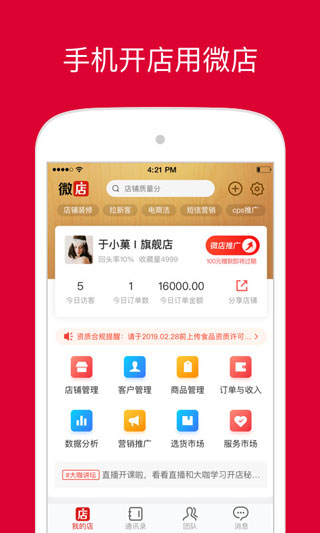 微店店长版app官方版有着社区,组织,店主群多种方式帮你寻找志同道合的店主一起成长
