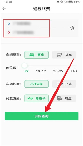随后输入起点和终点,再选择车辆信息点击开始查询