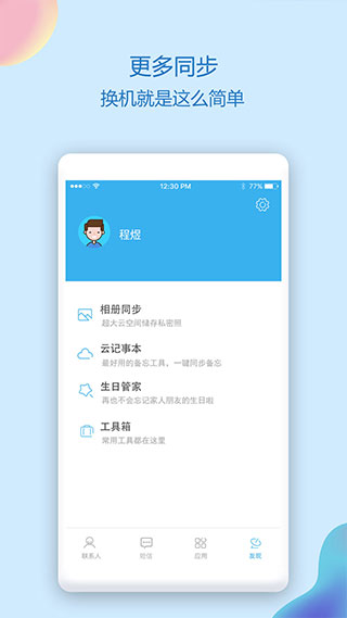 1、【联系人同步】新旧用户双重选择模式,联系人秒速同步。智能去除重复联系人,一键清理失效联系人。
