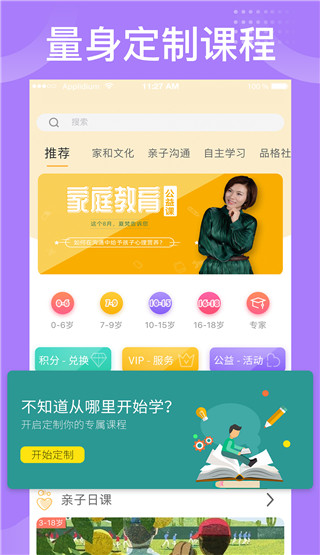 1、提供了0-6岁、7-9岁、10-15岁、16-18岁年龄段的家庭教育课程任选;