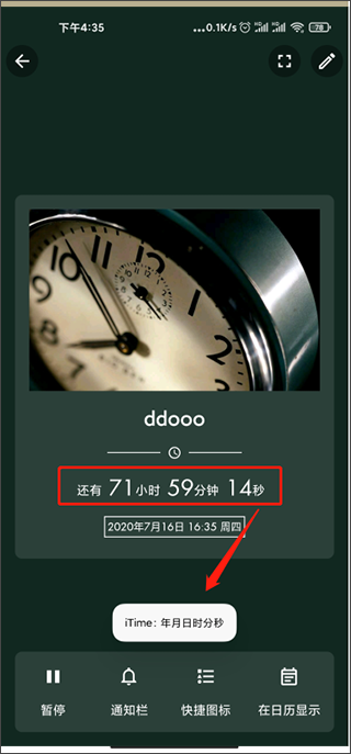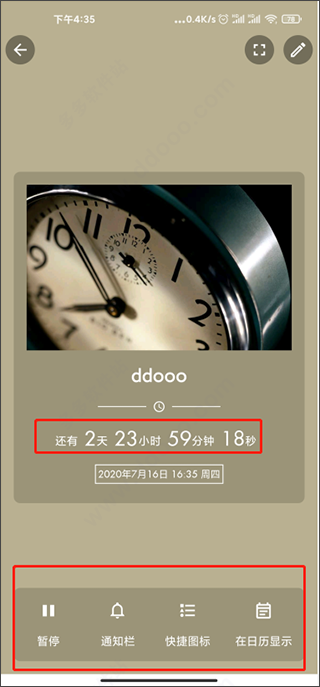 4、点击可查看详细,并在下方还能对其进行暂停、添加通知栏、快捷键图标、在日历显示等操作;