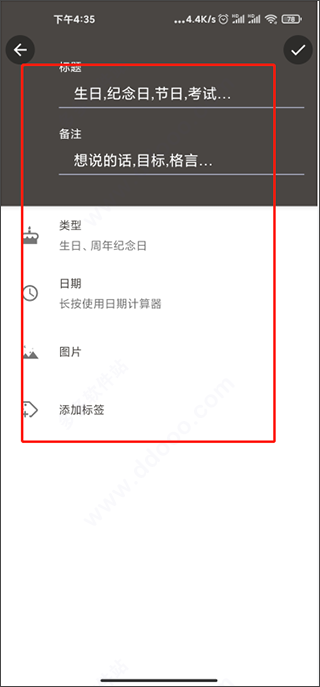2、根据需求自定义设置标题、备注、类型、日期、图片、标签等内容;