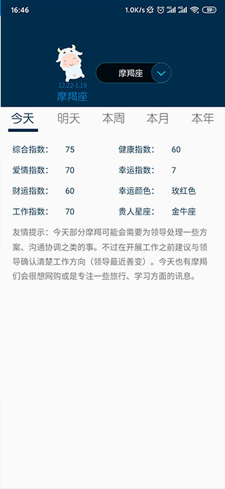 5、可以查询今年、本月、今日、明天您的财运,事业运,和爱情运。
