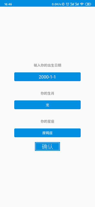 1、在本站下载安装,并且运行姓名星座缘分配对app安卓版,然后填写出生日期、生肖、星座后,点击确认即可: