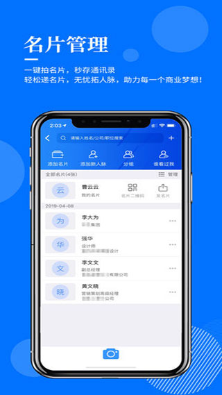 3、名片管理:指尖查app支持一键拍名片,秒存通讯录。