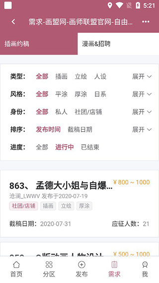 5、在需求栏中,支持选择类型、风格、身份、进度等相关信息,从而可以快速找出你需要信息。