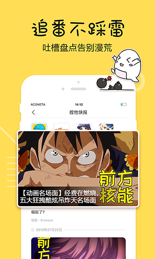 新番上映预告、PV公开、最新动漫情报,让你不错过任何二次元大小事!经典热门番剧吐槽盘点,帮你迅速新番扫雷,更快找到心仪作品,告别漫荒。
