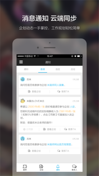 4、通知消息与网站同步,邀请、应征、选定、推送,现在你只要登陆APP就能迅速查收以上类别的通知。