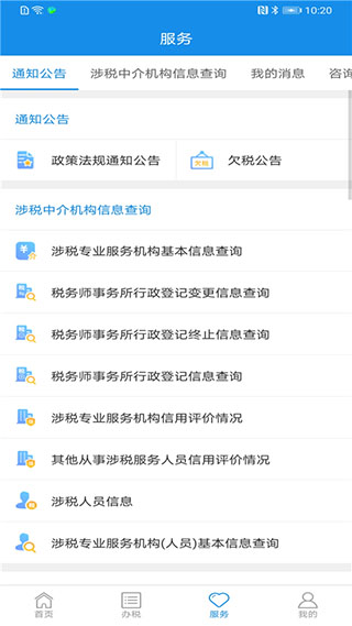 三、服务:提供查询,权益保护,预约办税,通知公告,咨询辅导,公共查询五大项服务。