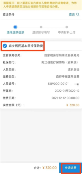 5、选择退款信息。勾选需要退费的数据信息,点击“申请退费”按钮。