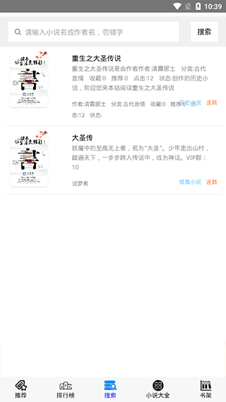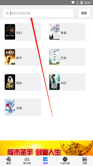 2、在最上面的搜索栏中输入想要找的小说或者作者名字,点击搜索;