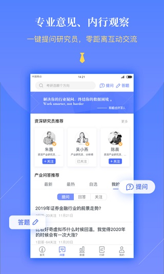 和研究员、专业人士零距离交流,第一时间获得有针对性的权威解答。相比起「分答」的付费问答、免费的「知乎」提问,「前瞻经济学人」的问答体系同时具备专业和免费两个特点