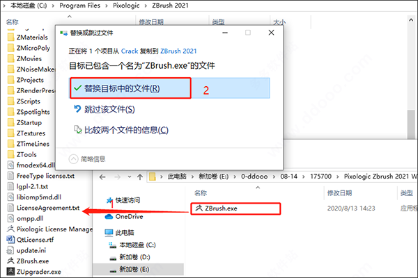 7、将从本站下载的crack文件夹中的“ZBrush.exe”复制到软件根目录下,并进行替换;