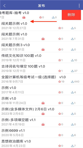 8. 如果要删除某个已发布的试卷,向左滑动该试卷行,会出现删除按钮。