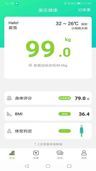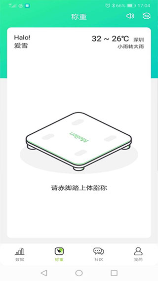 1、在应用数据页面,客户可以查看对应的数据;2、在应用称重界面,可以进行体重称重;