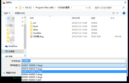 通过该软件可以将dwg图纸保存为不同的版本,也可以保存为PDF格式,以及文件加密等,如下图所示。