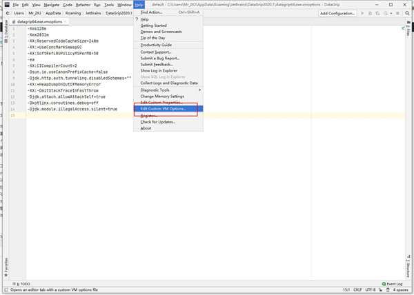 12、在菜单栏Help中选择Edit Custom VM Options,如果弹出提示选择Create即可