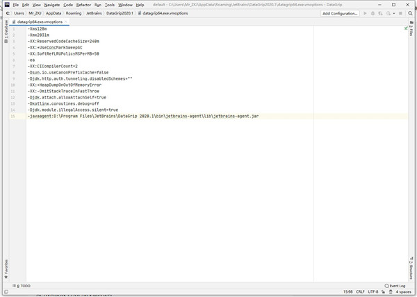 13、在最后一行添加:-javaagent:你DataGrip的安装目录jetbrains-agent.jar,然后退出软件