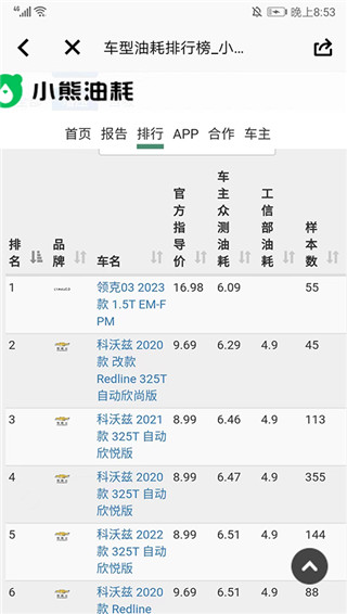 4、往下滑动界面,可看到各个车的油耗情况了,并且是按油耗从低到高依次排序。