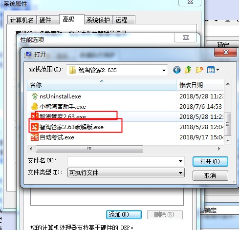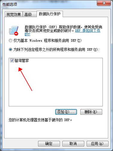 选择数据执行保护-勾选为除下列选定程序之外的所有程序和服务启用DEPQ),选择智淘淘客助手,点击添加