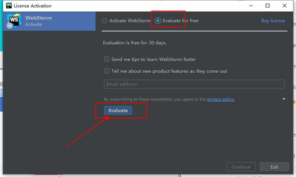 8、在桌面运行打开软件,弹出注册界面,选择evaluate for free,然后点击evaluate试用软件