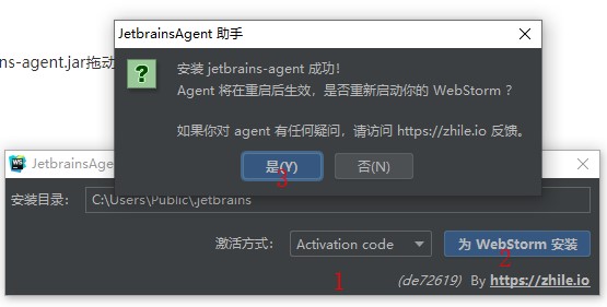 11、软件打开之后,弹出激活方式,首先选择activation code,然后点击为WebStorm安装,最后点击是重启软件