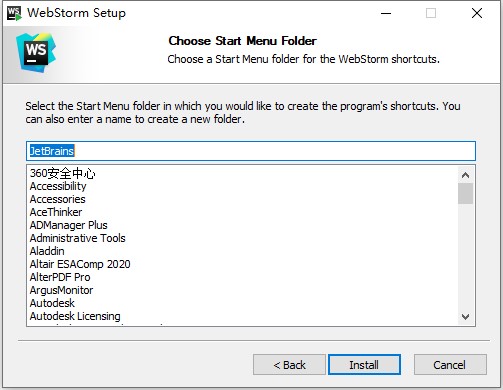 5、选择开始菜单文件,默认即可,点【install】开始安装;