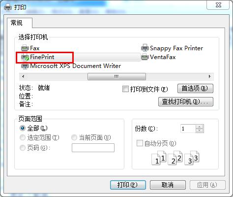 1、安装完成,任意打开一个软件、文档或者文件,然后选择打印功能,弹出打印窗口,我们双击FinePrint打印机。