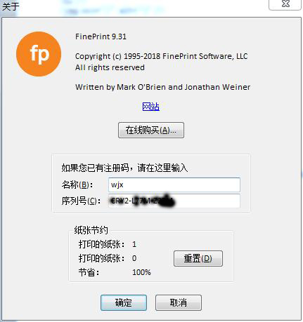2、弹出了如下的FinePrint界面并附带注册窗口,若未弹出注册窗口,请点击“设置-关于”,然后输入序列号和名称,名称任意输入,输入序列号:****-****-Z27M
