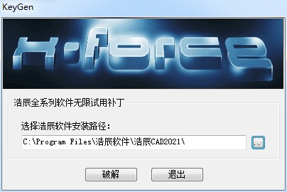 7、进入软件之后,运行crack文件夹下的“KeyGen.exe”,选择浩辰CAD2021的安装目录,点击“破解”
